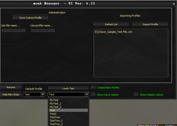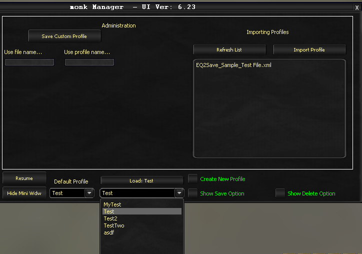 In my sample file, "EQ2Save_Sample_Test File.xml", there are actually two profiles. "MyTest" and "TestTwo".