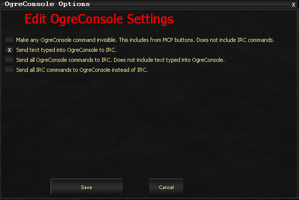 [X] Make any OgreConsole command invisible. This includes from MCP buttons. Does not include IRC commands.