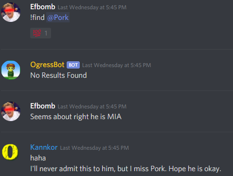 Even though Pork and myself are very private people, when you talk to someone every day, parts of your real life "slip" in. I've known for a long time that Pork's health wasn't the best. The end of 2019/start of 2020, Pork became sick, I assumed the common cold, but I didn't know. He then didn't show in vent, or on discord. Of course, I sent him a smart ass message, and hoped he was resting. Then days went on without hearing from him, then a week, then two weeks. I leveled up Stalker mode to 99999999. Used every trick I had to find his name/location, called hospitals, look up obituaries. Nothing, could not find anything. But.. nothing was good... right? He's just sick and resting, he'll be back.